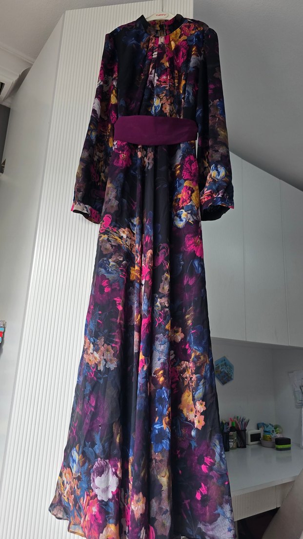 Mor renkli, yüksek yakalı, bol kesim uzun elbise. Drapeli, koyu tonlarda tie-dye desenli ve askılı kollu, romantik akşamlar için uygun.