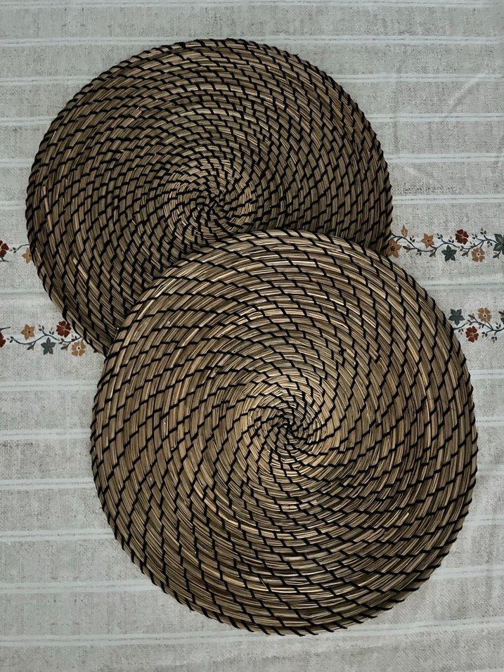 Bohem tarzda, kahverengi detaylı iki yuvarlak Amerikan servis. Masanıza dokunuş katar.