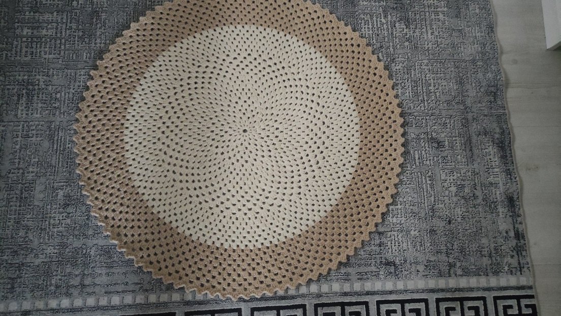 Yuvarlak, bohem tarzda el örgüsü halı, bej ve kahverengi tonlarında yumuşak dokulu. Ev dekoruna sıcaklık katar.