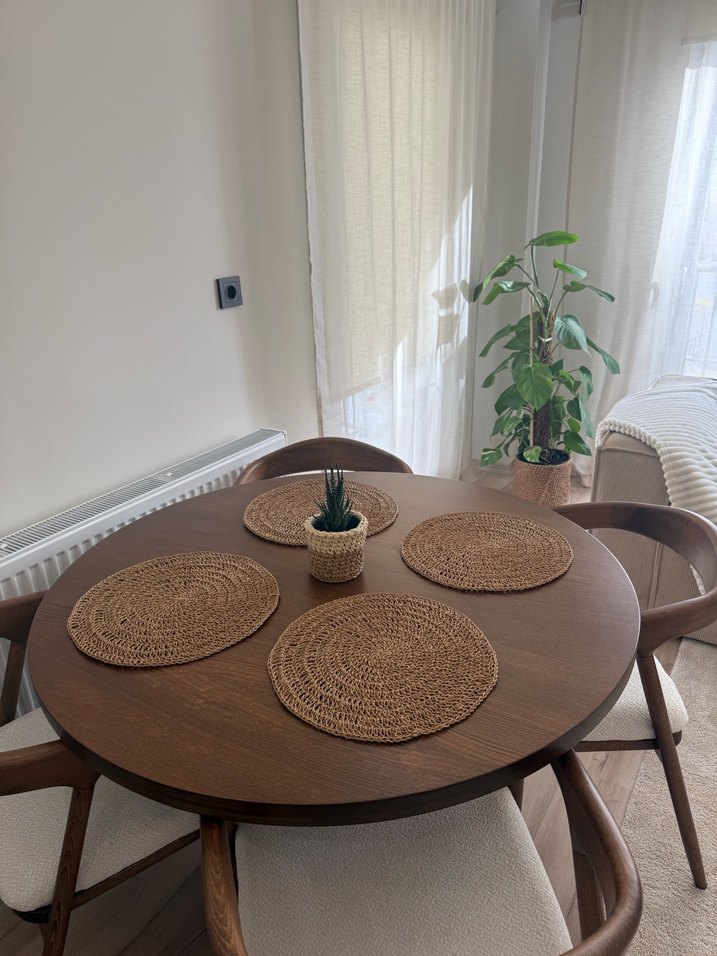 Doğal dokuma malzemeden yapılmış, bohem tarzda yuvarlak kahverengi Amerikan servisleri. Masanıza sıcak ve doğal bir dokunuş katar. El örgüsüdür 34cm elde yıkanıp ütülenebilir 4 ADET FİYATIDIR