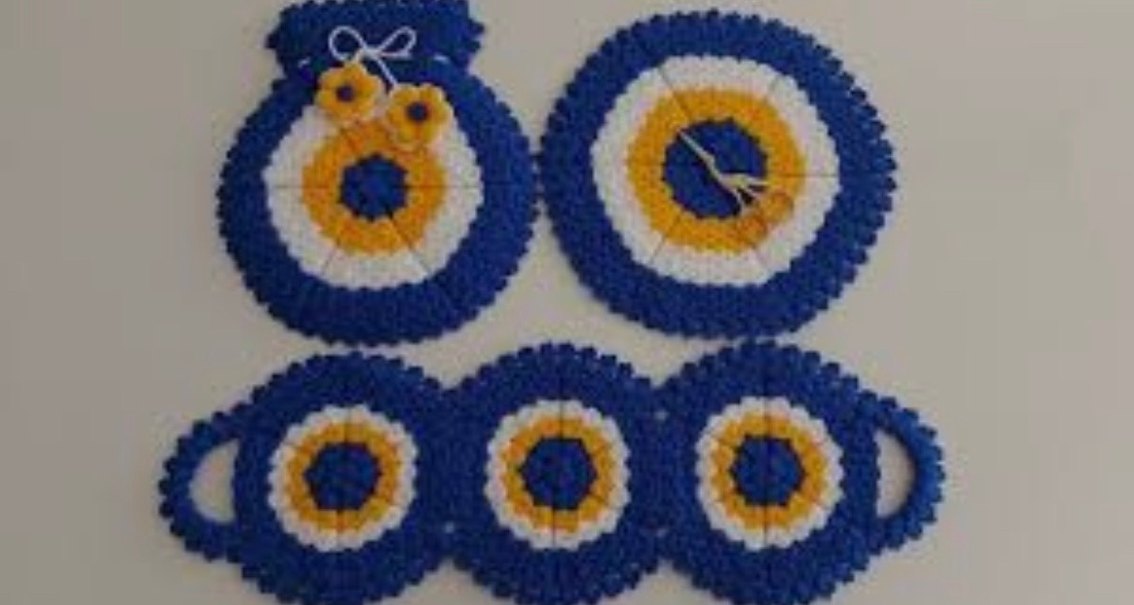 Mavi, beyaz ve sarı renklerde bohem tarzda yuvarlak örgü set, ev dekorasyonunuza el yapımı bir dokunuş katar.