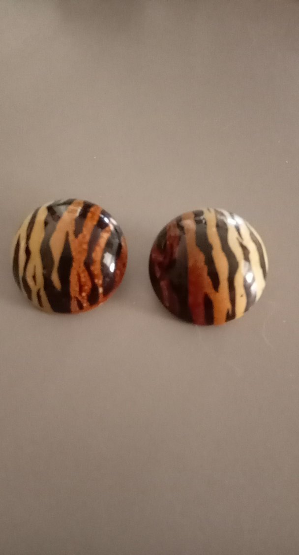 Bohem tarzda, kahverengi tonlarda renkli zebra desenli düğmeli küpeler, vintage havası ve dış mekan kullanımı için uygundur.