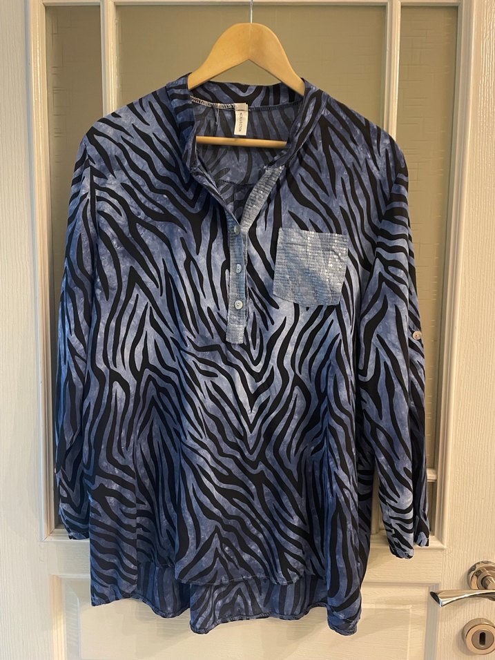 Kadınlar için bohem tarzda, uzun kollu, düğme klapası ve cebi pul detaylı gömlek. Mavi ve lacivert zebra desenli, rahat kesim, günlük kullanıma uygun olup son derece zarıf ve şıktır. 44 beden ve kolda katlama detayı mevcuttur