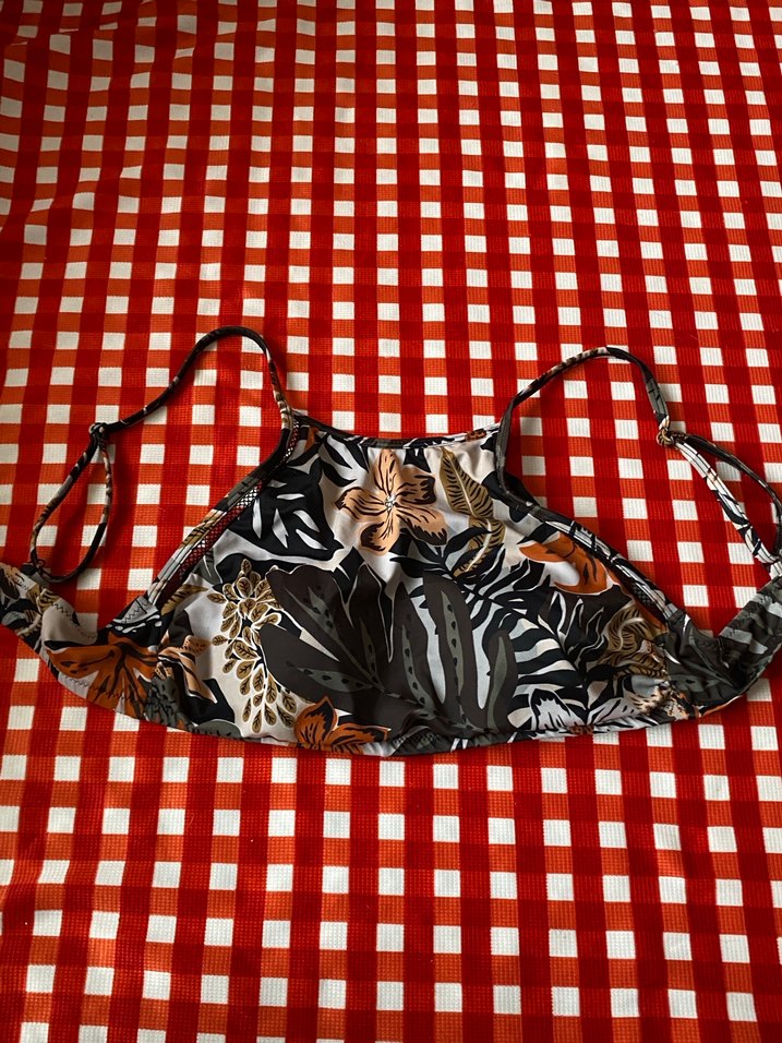 Kadın mayo, koyu renkli çok renkli zebra desenine sahip. Sentetik kumaştan yapılmış, fermuarlı bölümüyle açık hava kullanımı için uygun.
