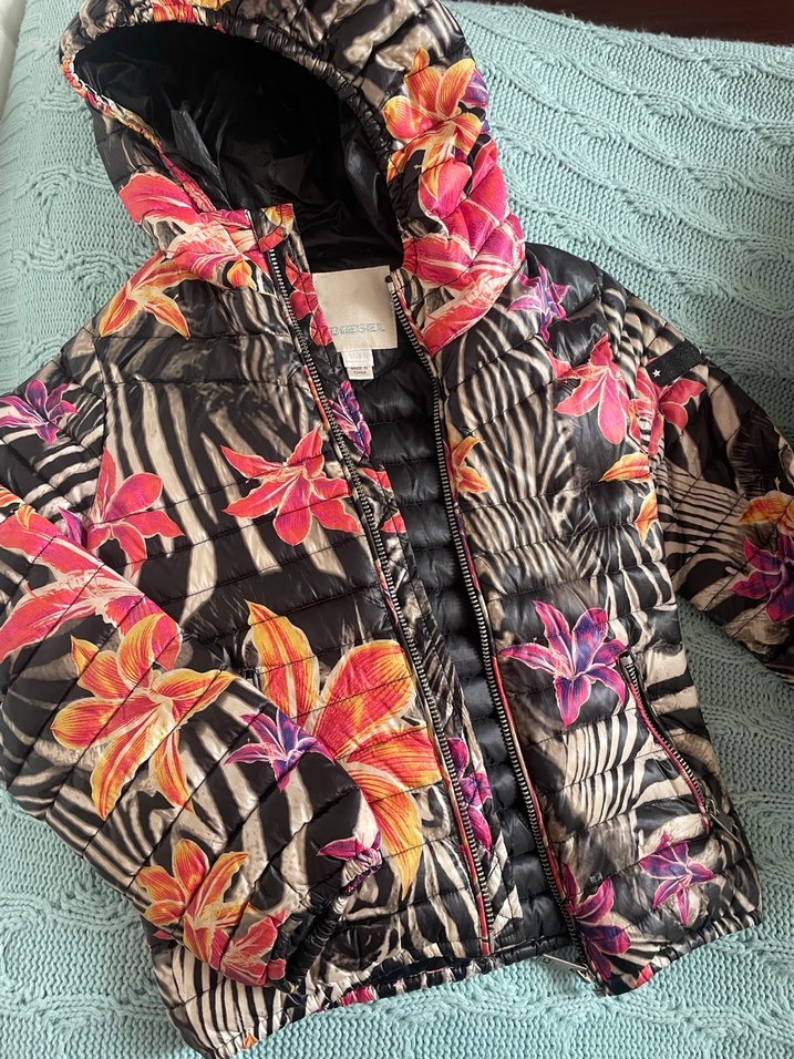 Kapüşonlu, uzun kollu, bohem tarzda, zebra desenli ve canlı çiçek detaylı, kürklü, normal uzunlukta kadın mont. 6 yaş çocuk