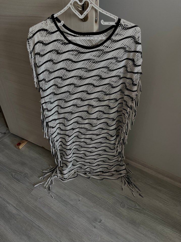 Kolsuz, bohem tarzda, zebra desenli paroeo Yuvarlak yaka ve salaş kesimlidir. Kısa boy ve püsküllü detaylara sahiptir.