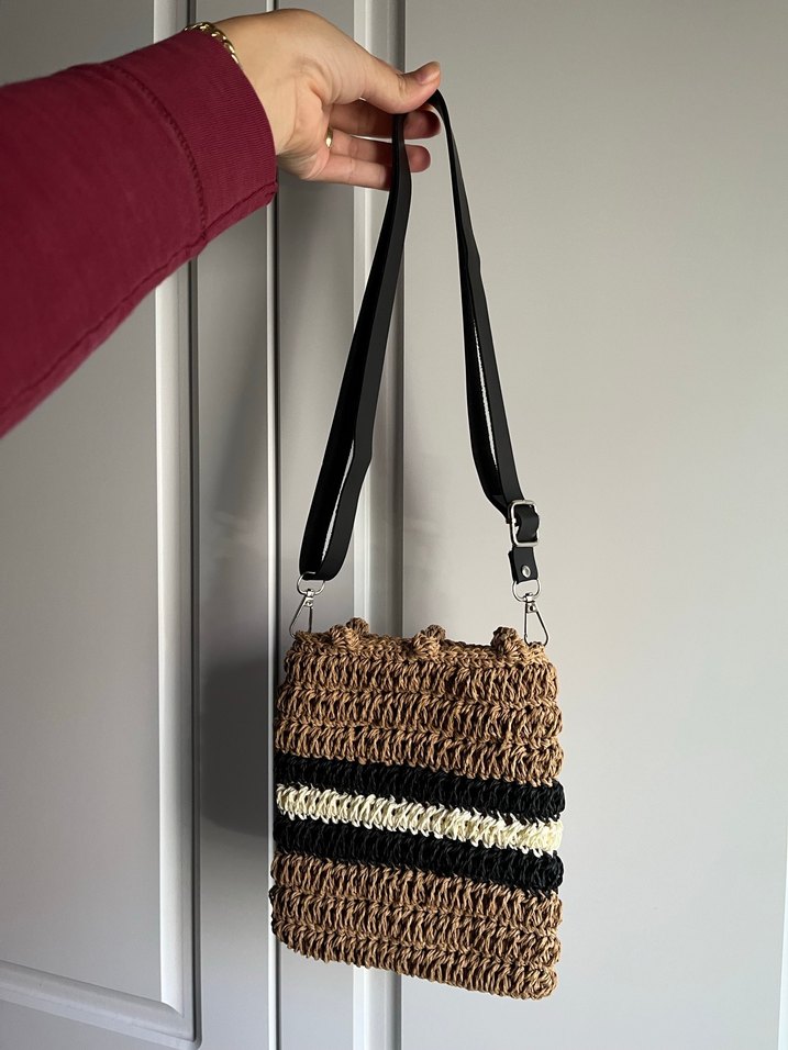 Bohem tarzda, kahverengi örgü kadın çanta, zebra desenli ve ayarlanabilir siyah askılı, günlük kullanım için uygun.