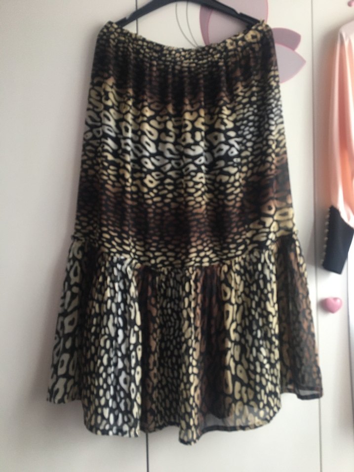 Bohem tarzda, piliseli detaylı, kahverengi zebra desenli uzun ve bol kesim etek, günlük kullanıma uygun.