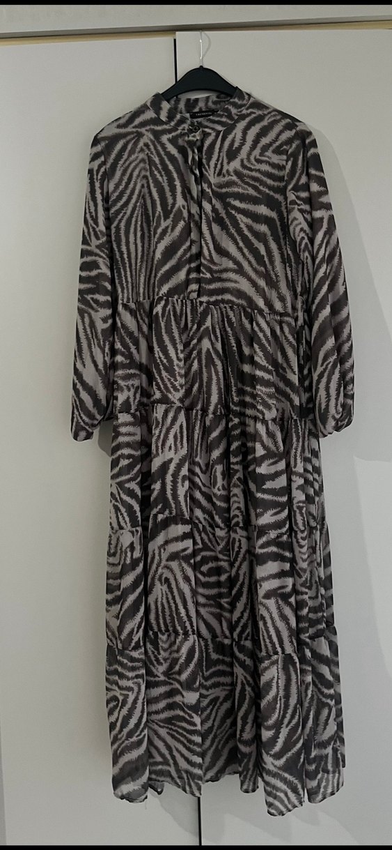 Yumuşak sentetik kumaştan, gri zebra desenli, yüksek yakalı ve fırfır detaylı bol kesim uzun elbise. Bohem tarz için uygun. Defosu yok kemerli. Yazlık efil efil.