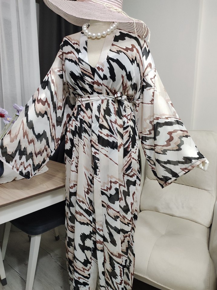 Bohem tarzda, kahverengi ve gri zebra desenli, uzun, bol kesim ve drapeli, askılı kollu V yakalı kimono. Yumuşak sentetik kumaştan üretilmiştir.