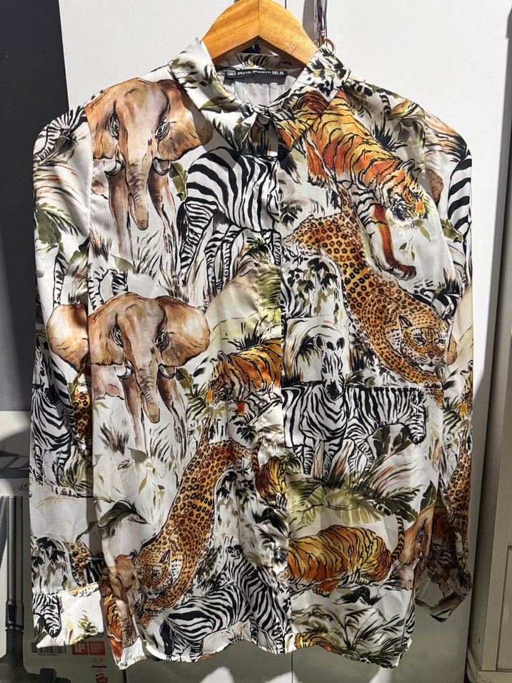 Bohem tarzda, çok renkli zebra ve hayvan desenli, hafif sentetik kumaştan, yakalı ve uzun kollu bol kesim gömlek.