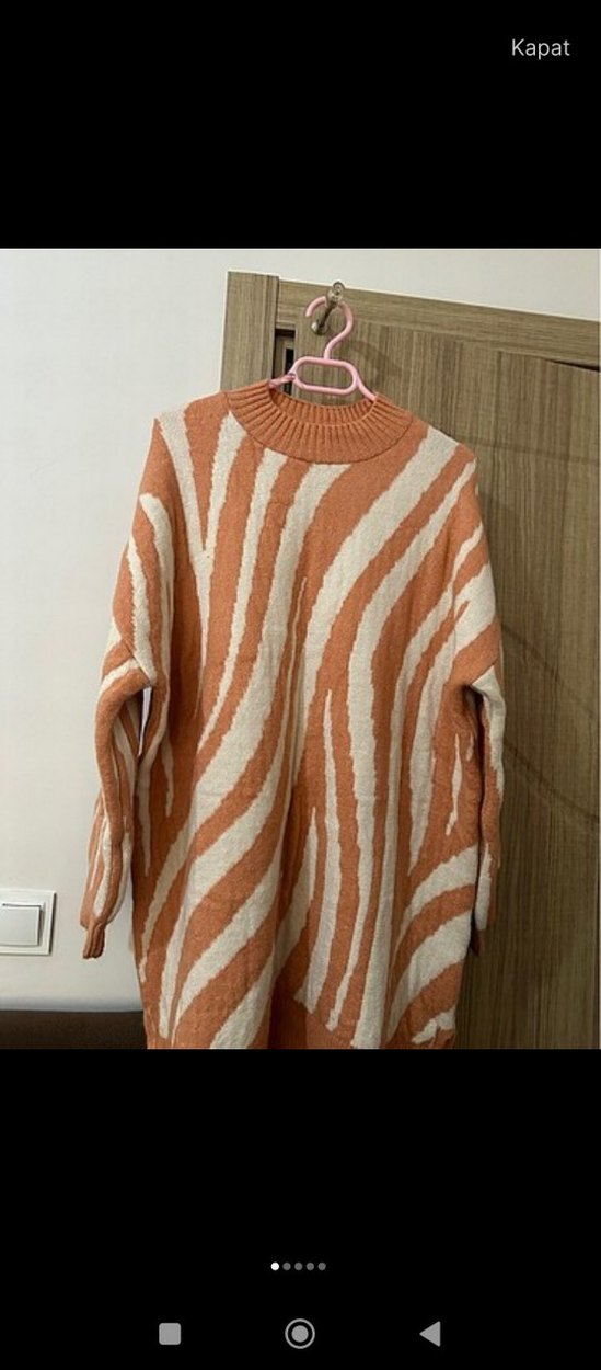 Bohem ve retro tarzda, uzun kollu, yüksek yakalı, örgü, kahverengi pastel zebra desenli, bol kesim kazak. Rahat ve sıcak dokusu ile günlük kullanıma uygun.