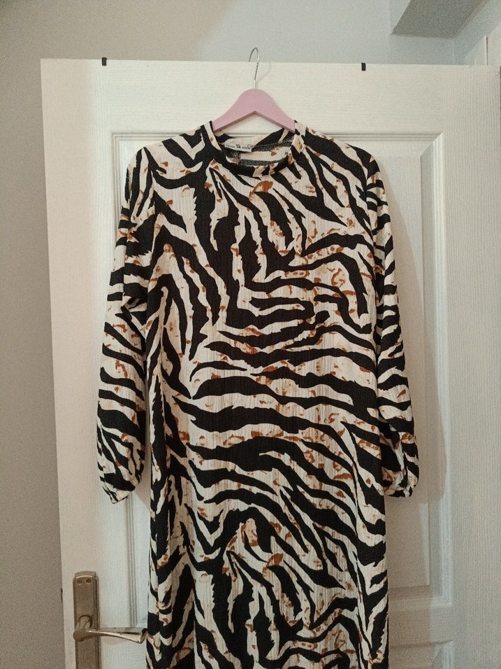Bohem tarzda, zebra desenli, uzun kollu, yüksek yakalı, bol kesim sentetik kumaştan yapılmış uzun elbise. kemeri vardır L beden. hiç giyilmedi sıfır ürün