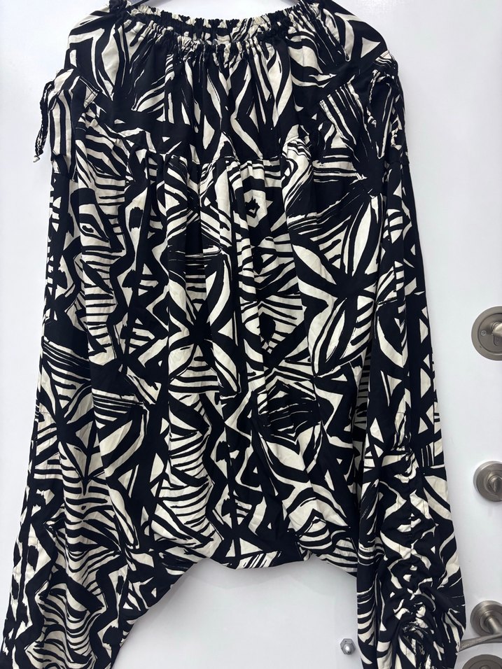 Siyah-beyaz zebra desenli, bol kesim ve drapeli şalvar pantolon. Yumuşak sentetik kumaştan, günlük kullanıma uygun bohem tarzda.