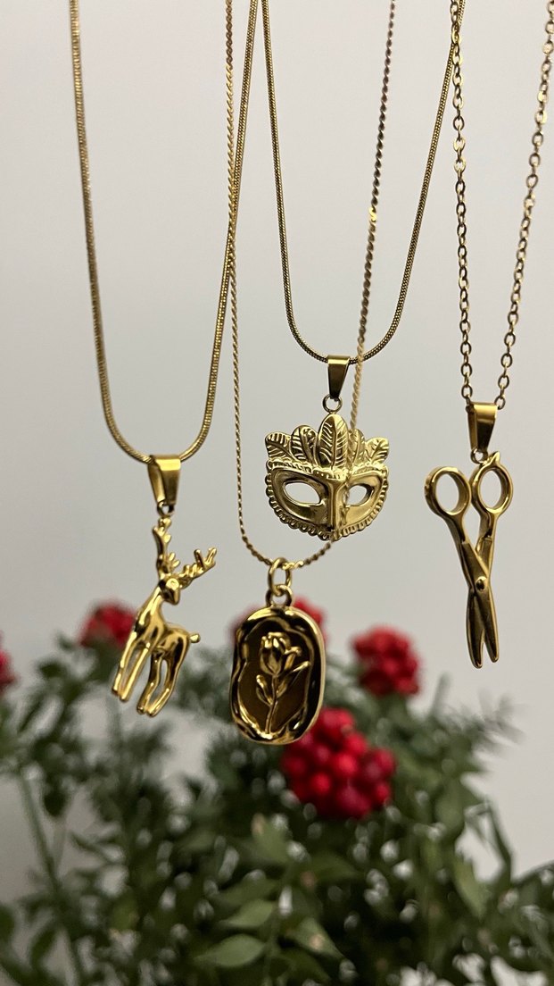 Bohem tarzda, detaylı zincirli altın renkli kolyeler. Geyik, çiçek, maske ve makas figürlü kolyeler, günlük kullanım için midi uzunlukta. ✨