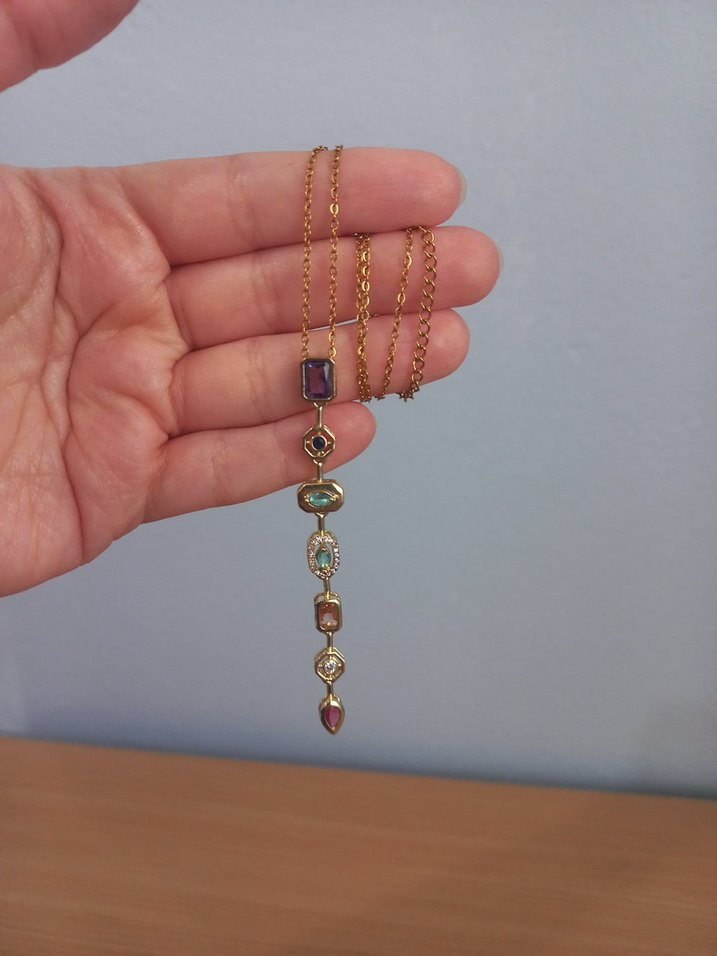 Bohem tarzda, zincir detaylı ve çok renkli taşlara sahip, yılan desenli midi uzunlukta kolye. Günlük kullanıma uygundur.