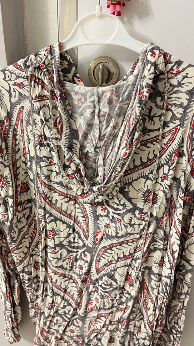 Gri zemin üzerine desenli, uzun kollu ve V yaka, bol kesim hamile tunik. Zincir detayları ile bohem tarzda tasarlanmıştır. Günlük kullanıma uygundur.