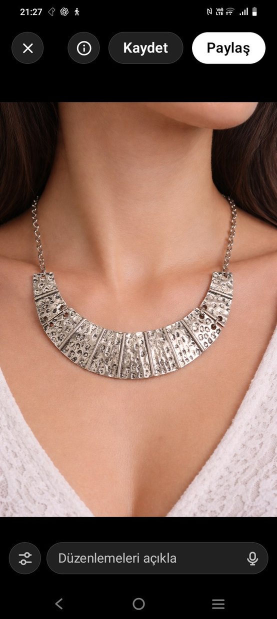 Bohem tarzı, etnik desenli, zincir detaylı, kısa ve parlak gri kadın kolyesi.