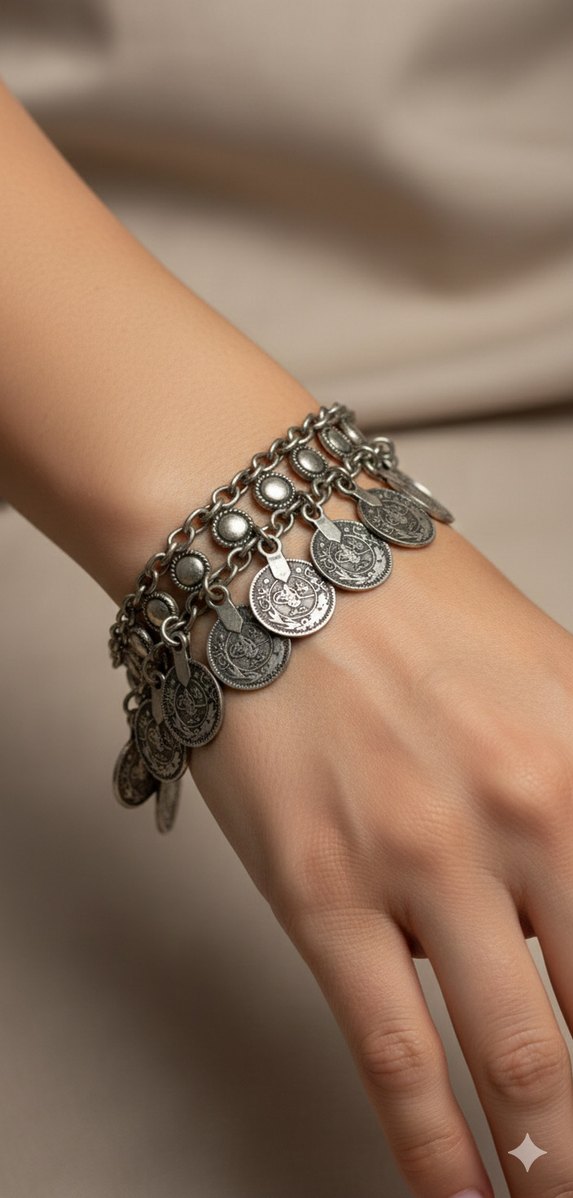 Altın renkli, zincir detaylı ve desenli bohem tarzda kadın bilekliği, günlük kullanım için uygun. Gümüş benzeri çok şık çok otantik bir bileklik , Bodrum’dan aldım ancak hiç kullanmadır