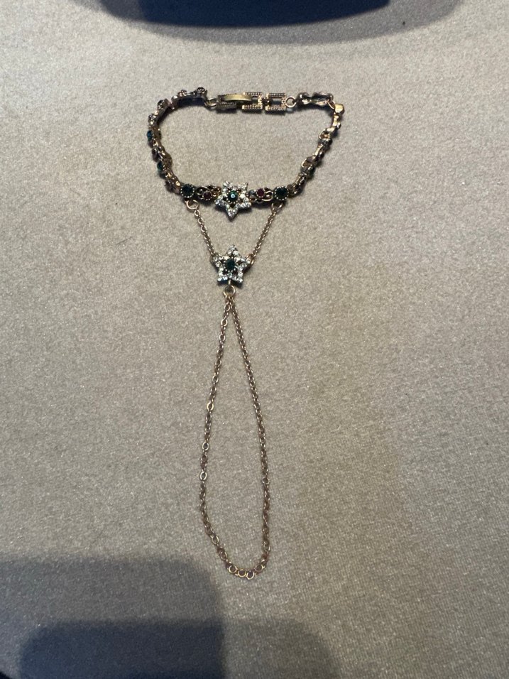 Bohem tarzda, zincir detaylı ve yılan desenli koyu altın renkli kadın el zinciri, vintage düğün kombinlerine uygun. ✨