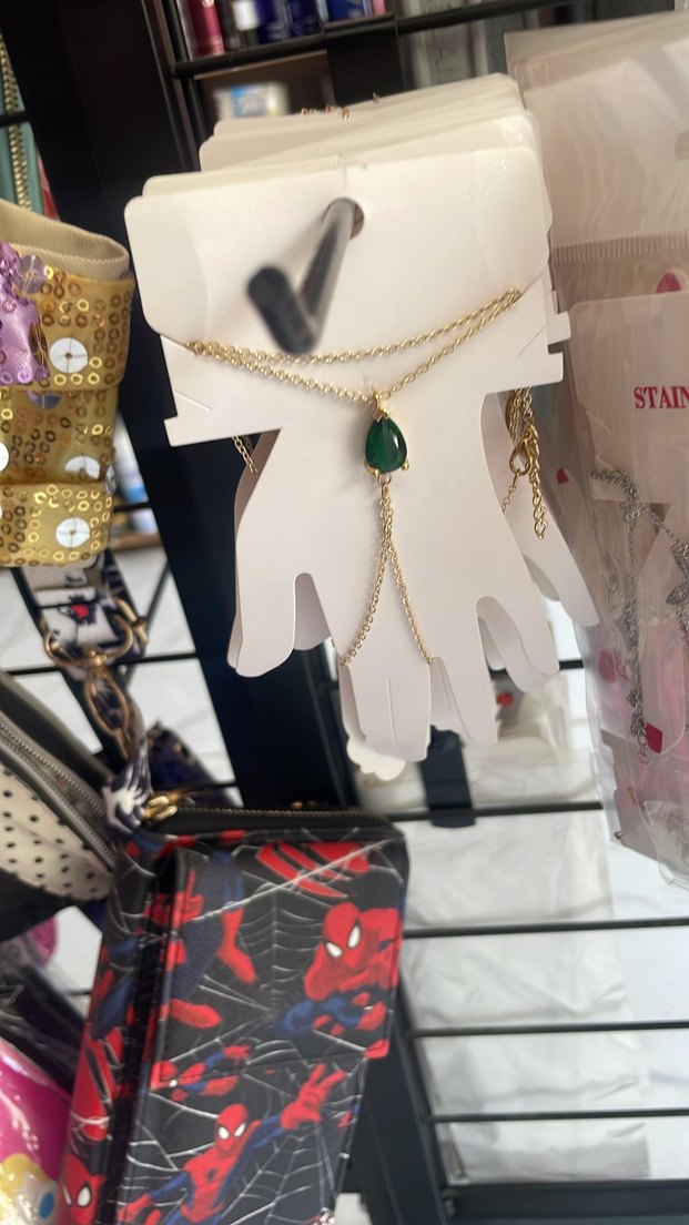Altın renkli, yeşil taş detaylı bohem tarzda kadın el zinciri. Minimalist baskılı deseniyle günlük kullanıma uygun.
