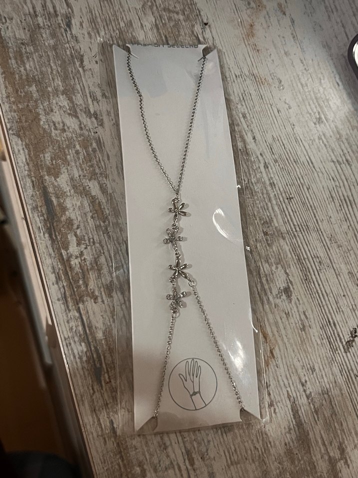 Bohem tarzda, zincir detaylı kadın el zinciri, gri ve beyaz nakışlı yıldız figürleriyle günlük kullanıma uygun. ✨