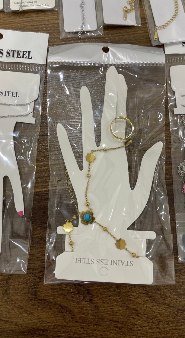 Altın renkli, çiçek ve turkuaz detaylı bohem kadın el zinciri. Paslanmaz çelikten yapılmıştır. Hafif ve desenli tasarımıyla günlük kullanıma uygundur.