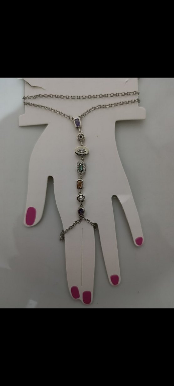 Zincir detaylı, çok renkli taşlarla süslenmiş ve hafif yılan deseni bulunan bohem tarzda kadın el zinciri.