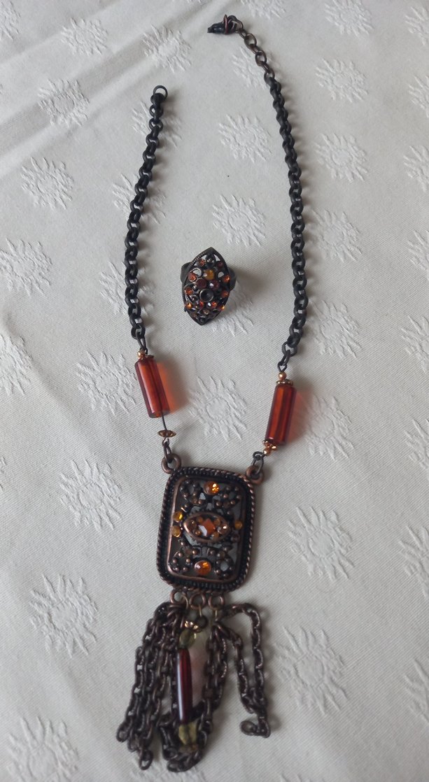 Kahverengi kısa kolye, zincir detayları ve etnik desenlerle bohem tarzı yansıtıyor. Günlük kullanıma uygun.kolyenin ucu koptu.yüzüğünde taşı düştü yaptırılabilir.bilekliğide koptu onuda yanında göndericem.anlayan tamir edebilir.