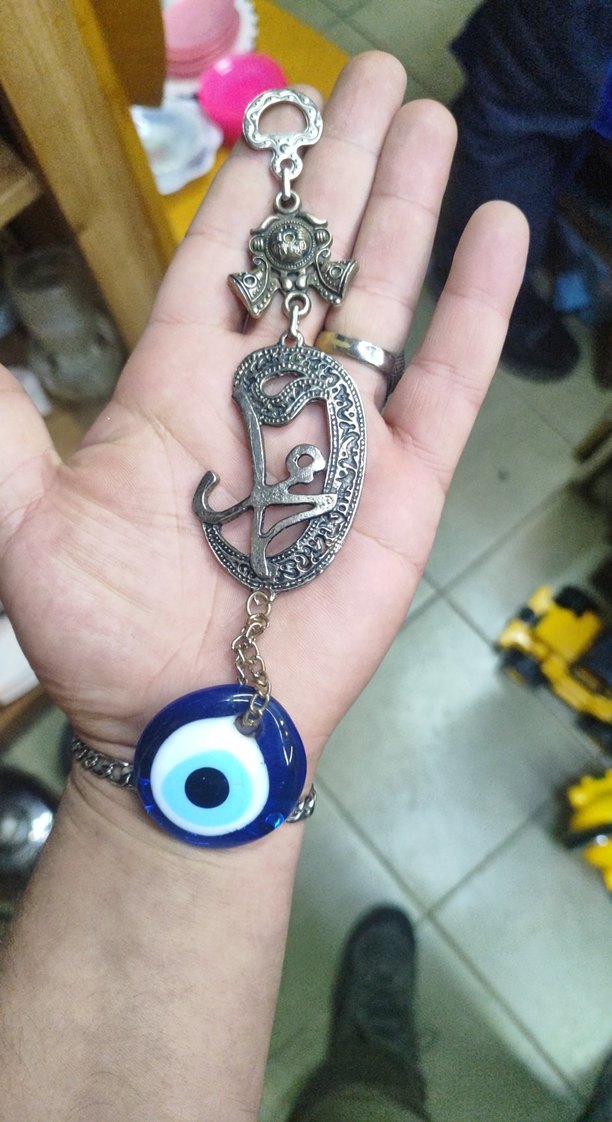 Bohem tarzda, zincir detaylı ve mavi nazar boncuğu olan renkli, retro hippie esintili anahtarlık.