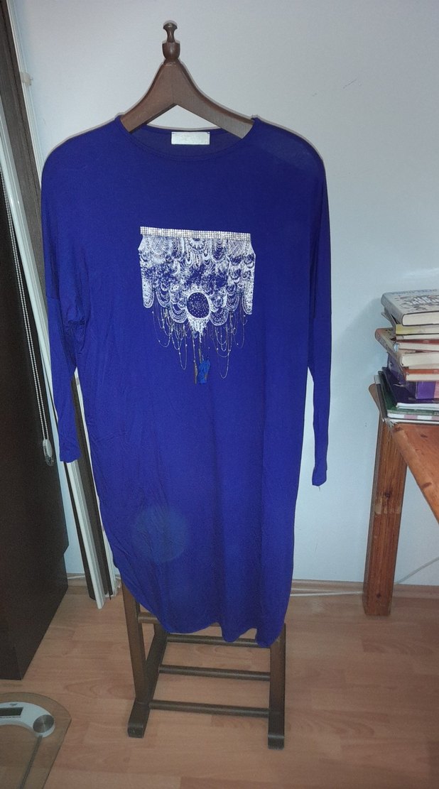 Bohem tarzda, zincir detaylı, uzun kollu ve yuvarlak yakalı, koyu mavi renkte bol kesim hamile gömleği. Yumuşak ve sıcak kumaştan, günlük kullanım için uygundur.