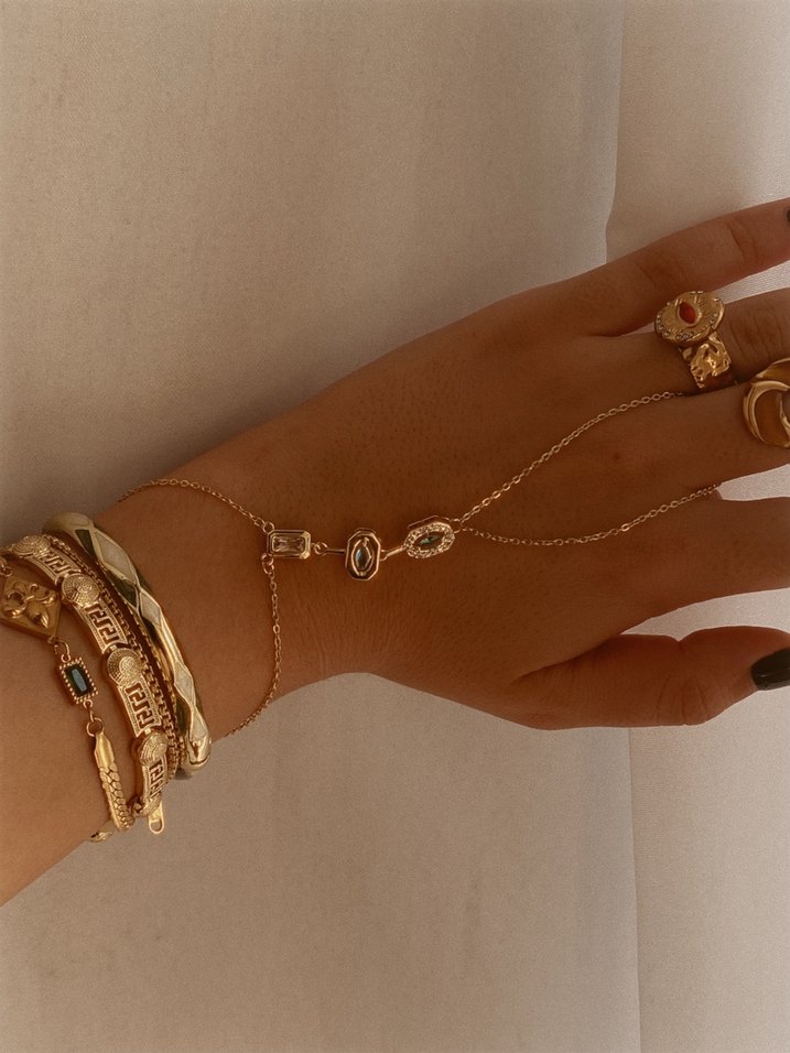 Altın renkli, zincir detaylı bohem kadın el zinciri, taşlı deseni ile günlük kullanıma uygun.