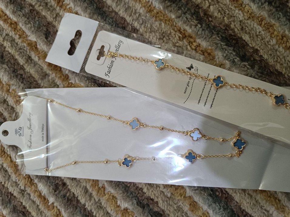 Altın renkli, zincir detaylı ve baskılı yonca desenli kadın el ve boyun zinciri, minimalist bohem stil için uygun, günlük kullanıma uygun.