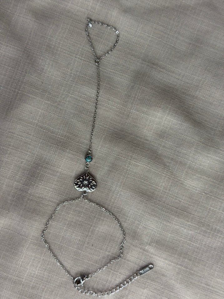 Zincir detaylı, turkuaz taşlı ve kalp figürlü bohem tarz kadın el zinciri.