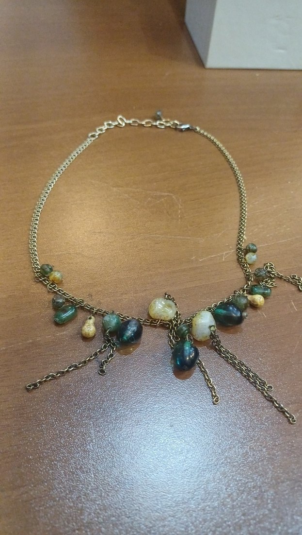 Bohem tarzda zincir detaylı, turkuaz taşlı, koyu tonlarda tie-dye desenli midi uzunlukta kolye. Günlük kullanıma uygun.