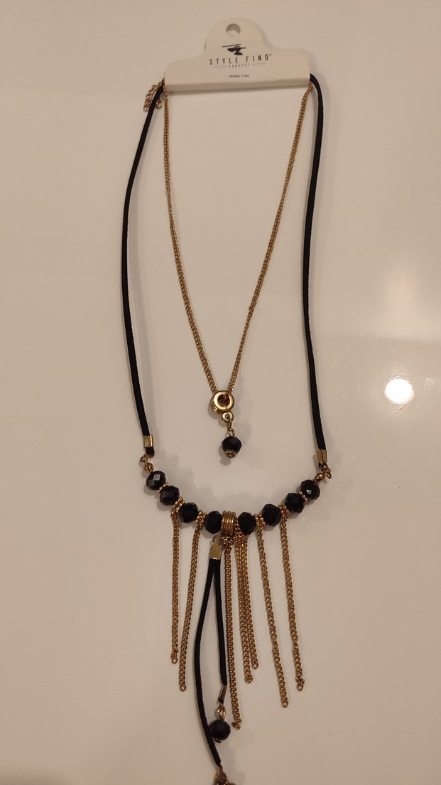 Altın renkli uzun kolye, zincir ve deri detaylı siyah boncuklarla günlük kullanım için bohem tarzda.
