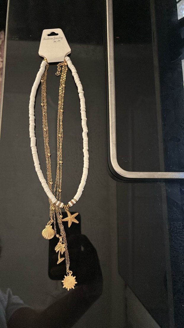 Altın renkli, zincir detaylı uzun kolye. Deniz kabuğu, denizyıldızı, palmiye ve güneş figürlü bohem aksesuarlar içerir. Hafif batik desenli boncuklar.