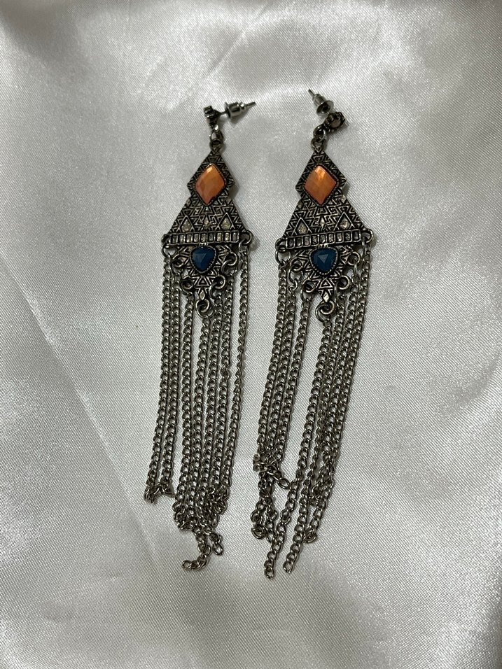 Uzun, desenli ve koyu renkli taşlarla süslenmiş zincir detaylı bohem tarzda küpeler, günlük kullanım için uygundur.
