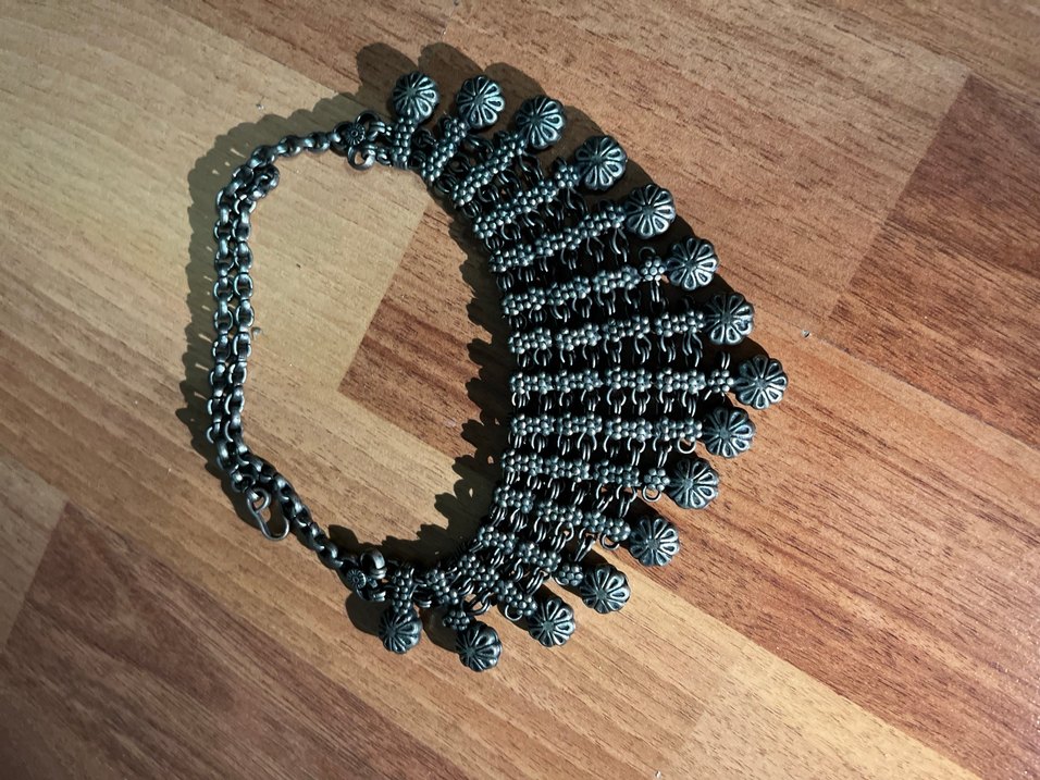 Uzun siyah kolye, zincir detayları ve nakışlı desenlerle bohem tarzını yansıtıyor. Açık hava etkinlikleri için uygun, retro ve koyu renkli bir tasarım.