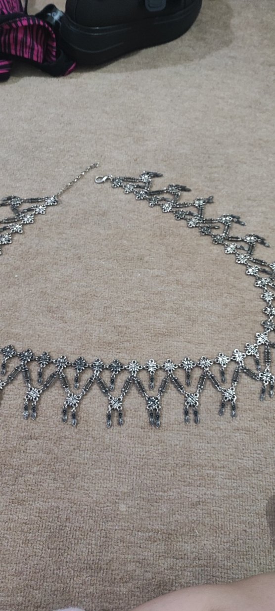 Gri tonlarda zincir detaylı ve nakışlı uzun vintage tarzda kolye, günlük kullanıma uygun. Bohem tasarım retro bir hava katıyor.