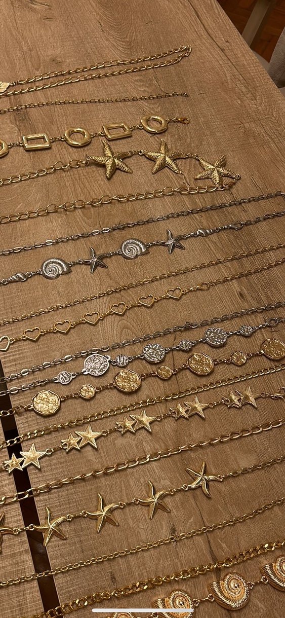 Parlak altın renkli bohem zincir detaylı, vintage nakışlı kadın bileklikler, günlük kullanıma uygun.