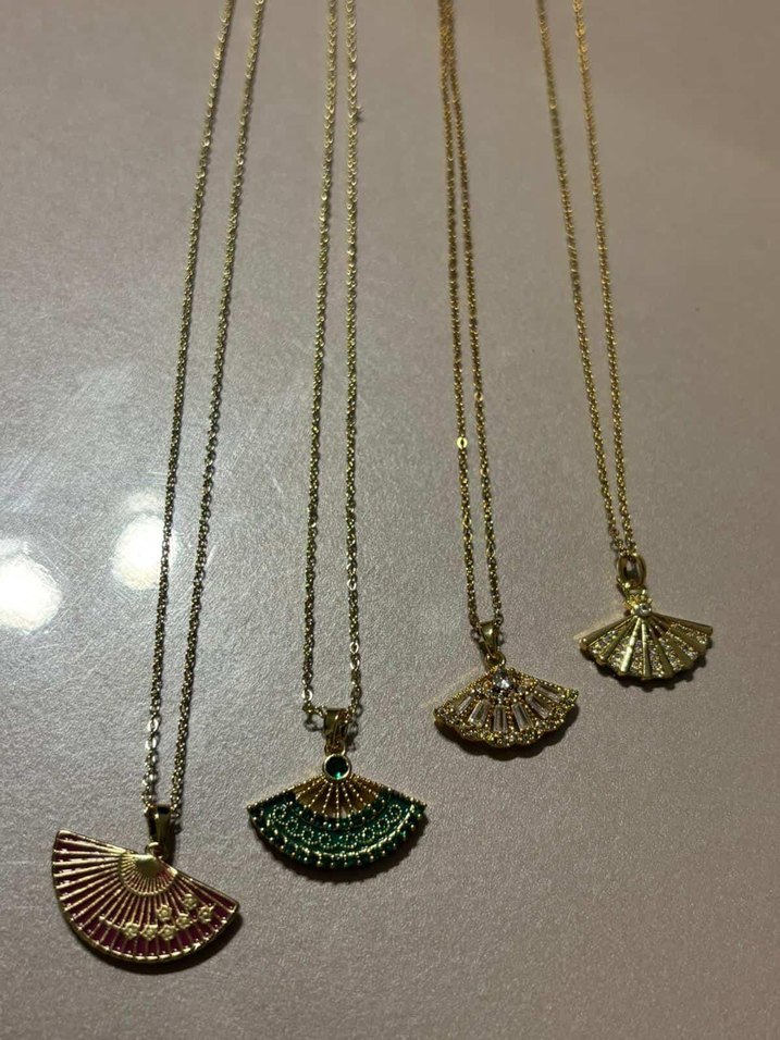 Bohem tarzda, zincir detaylı uzun altın kolyeler, nakışlı yelpaze kolye ucu ile günlük kullanıma uygun.