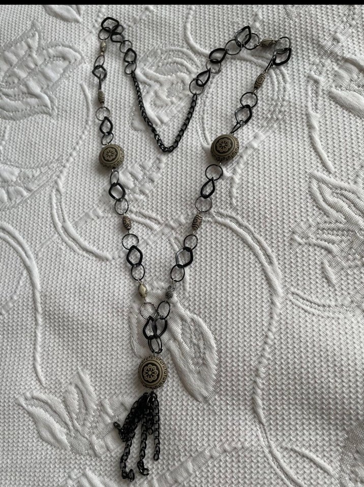 Gri ve beyaz tonlarda, zincir detaylı yılan desenli uzun bohem kolye. Günlük kullanıma uygun.