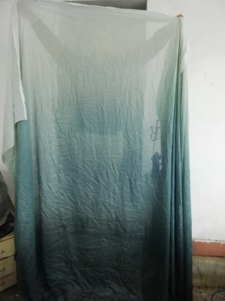 Üsten alta doğru koyulasıyo tonlarda batik desenli, bohem tarzda perde. Yumuşak geçişli renkleriyle ortama sanat dolu bir hava katar.