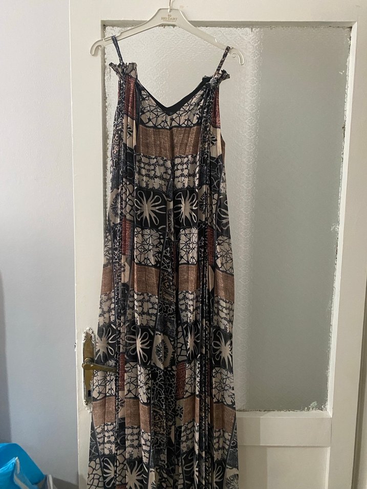 Uzun, bol kesim elbise, askılı ve straplez yaka ile drapeli tasarıma sahiptir. Çok renkli batik desenli yumuşak kumaştan, günlük kullanım için uygundur. Astarlidir hic kullanilmadi geri iade alimi yapmiyorum bunu bilerek alim yapiniz