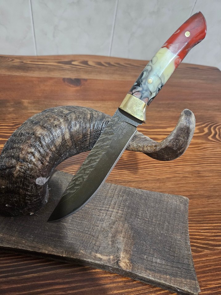 Böhler D2 çelik (tank paleti çeliği), pirinç balçak, epoksi kabzeye sahip özel el yapımı koleksiyonluk bir avcı kampçı bıçağı. Vaketa deri kılıfıyla birlikte gönderilecektir.