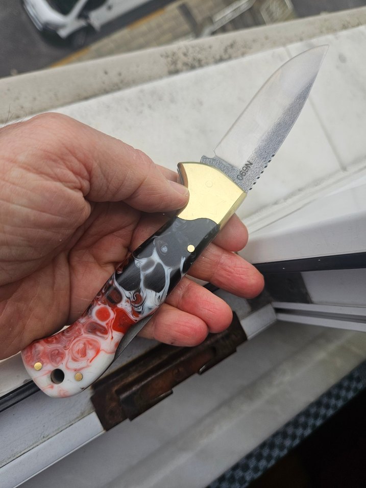 Çelik Böhler N690, sırttan kilitli, büyük boy av ve kamp bıçağı. Kabzesi pirinç balçaklı epoksidir, mekanizması yarıotomatiktir.