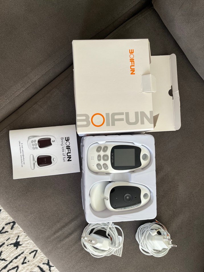 BOIFUN bebek monitörü ve kamera seti, beyaz monitör ve gri ekran ile birlikte gelir. İki şarj kablosu ve kullanım kılavuzu dahildir. Ürün yurt dışından hediye geldi hiç kullanılmadı küçük bi evde yaşadığımız için gerek olmadı açıkçası sağlam çalışır durumda istenilen takdirde videosu paylaşılabilir eksiği yok kutusunda sağlam bir şekilde duruyor
