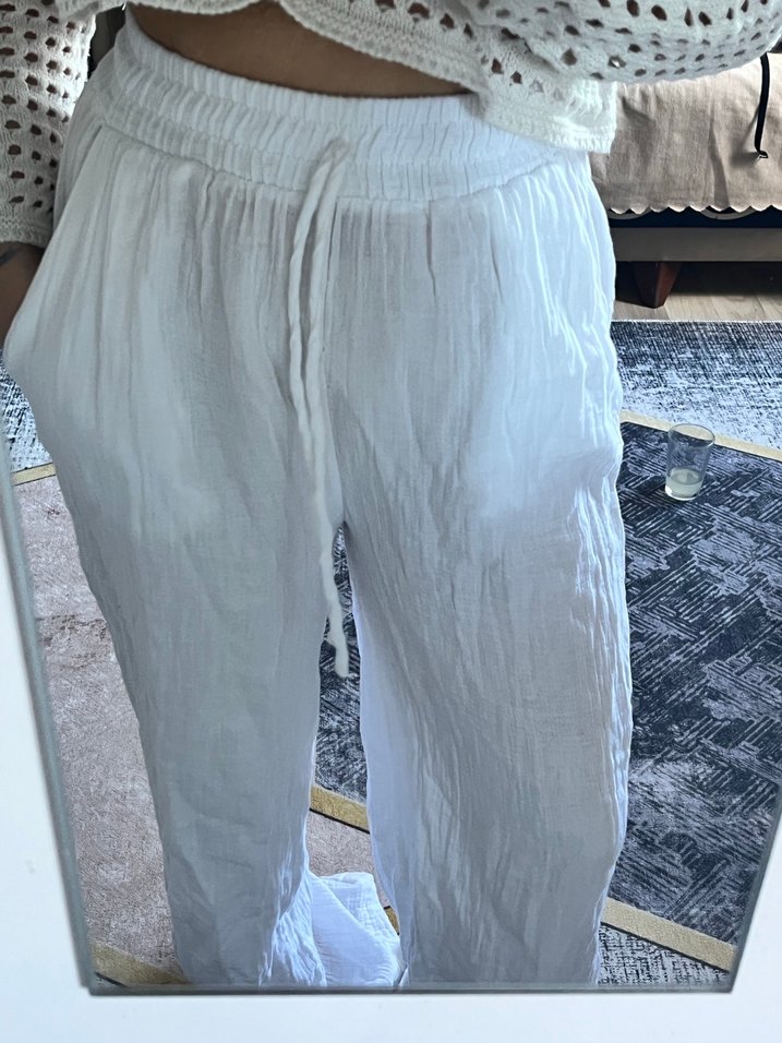 Bol kesim, pile detaylı beyaz keten midi pantolon, elastik bel bandına sahiptir, günlük rahat kullanıma uygundur. İç gösteriyor uygun iç camasıryla giyilmelidir