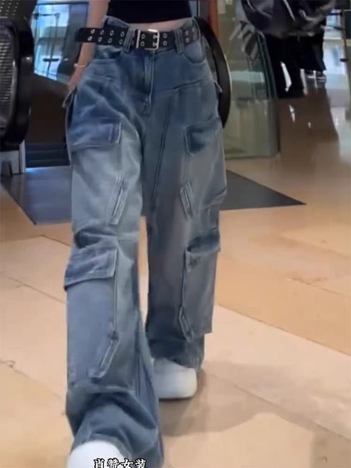 Gri bağcıklı bol kesim midi kot pantolon, bağcıklı ve tie-dye desenli, sokak stili ve grunge tarzı için cepli detaylara sahip. İthal üründür.